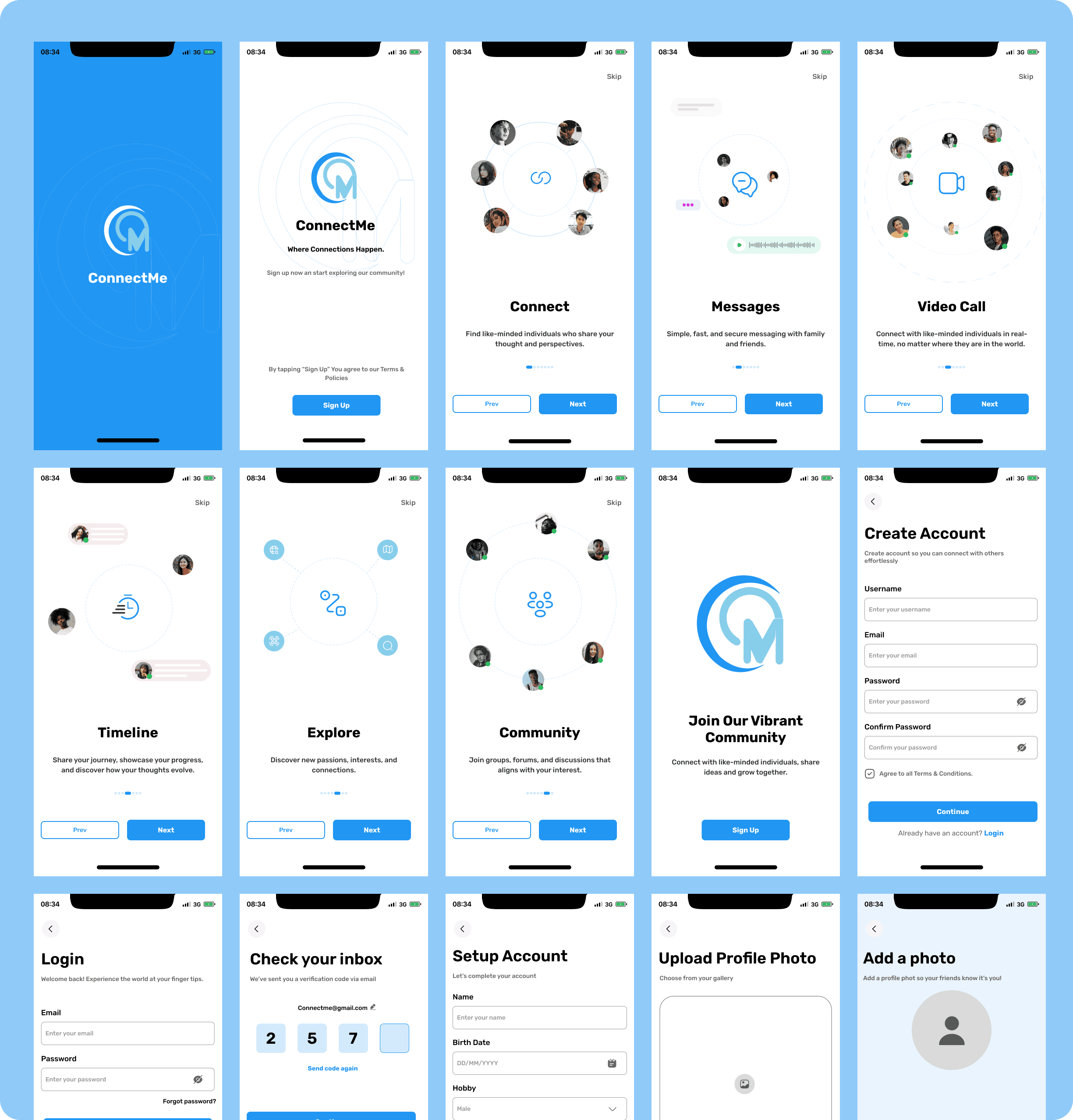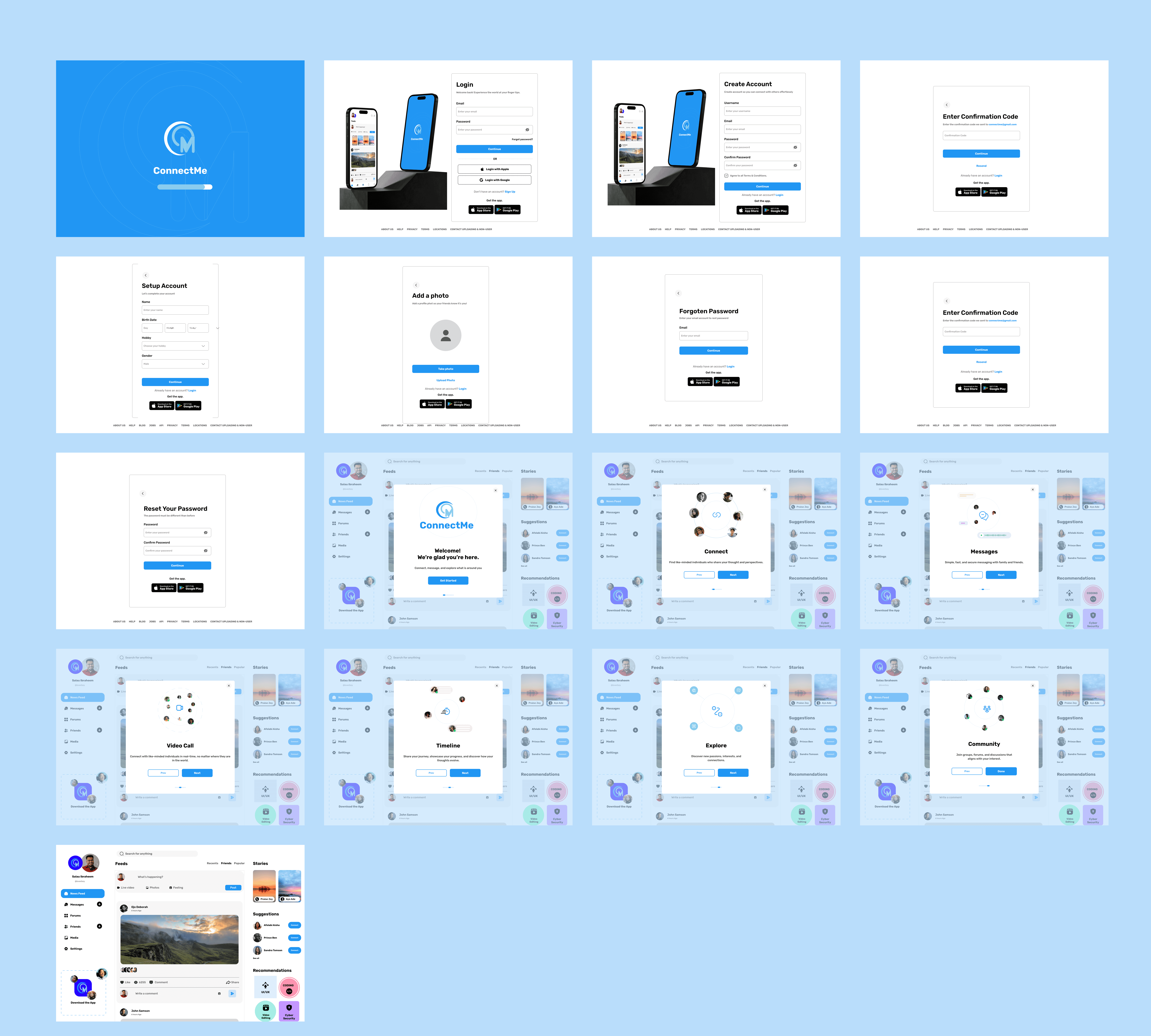 Connect Me is a social media platform focused on fostering meaningful connections and user engagement. I designed and prototyped the login section, onboarding screens, and homepage layout to ensure a seamless user journey from sign-up to interaction. The design emphasizes simplicity, responsiveness, and ease of use across devices, with engaging visuals to enhance user onboarding.