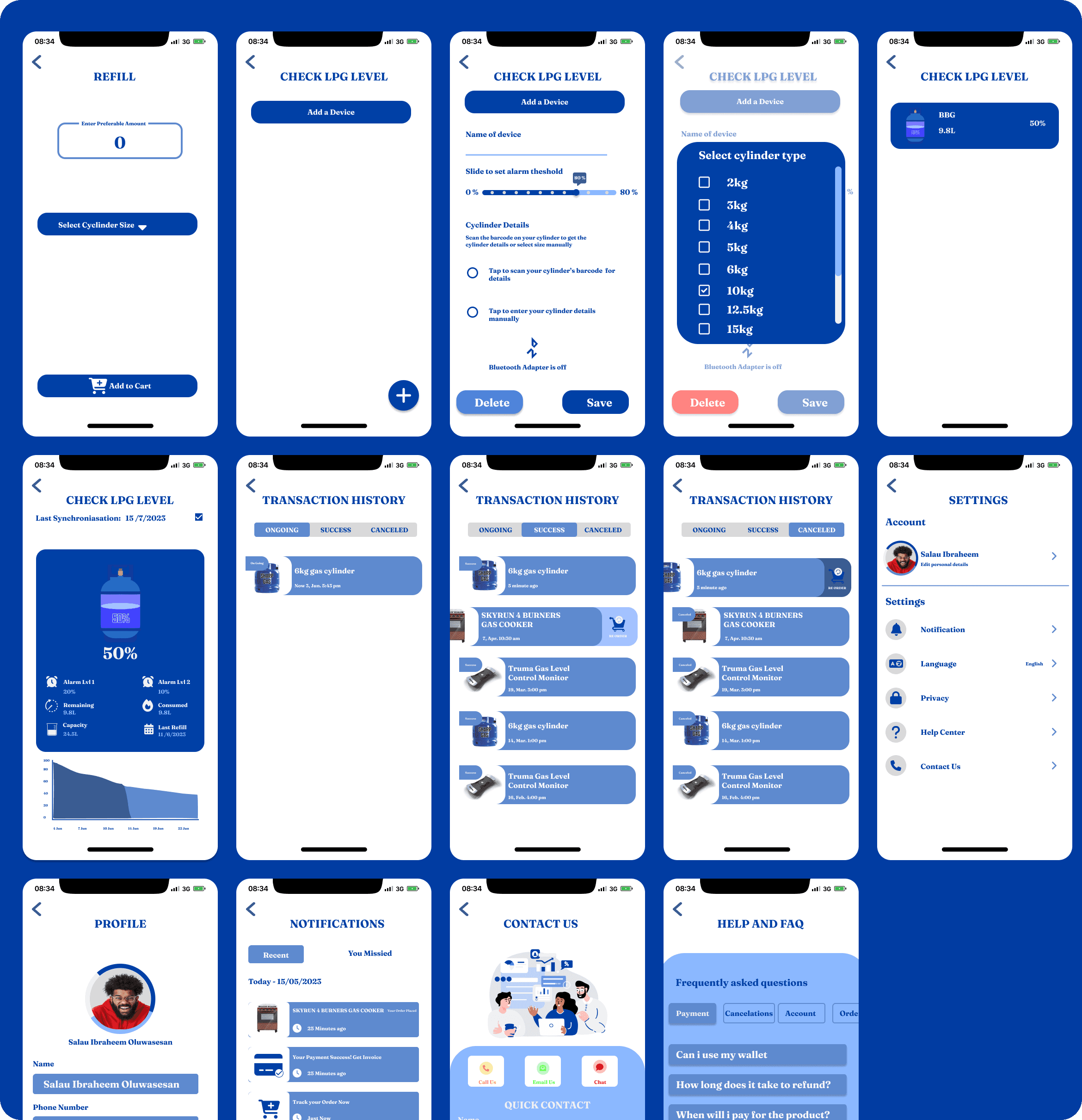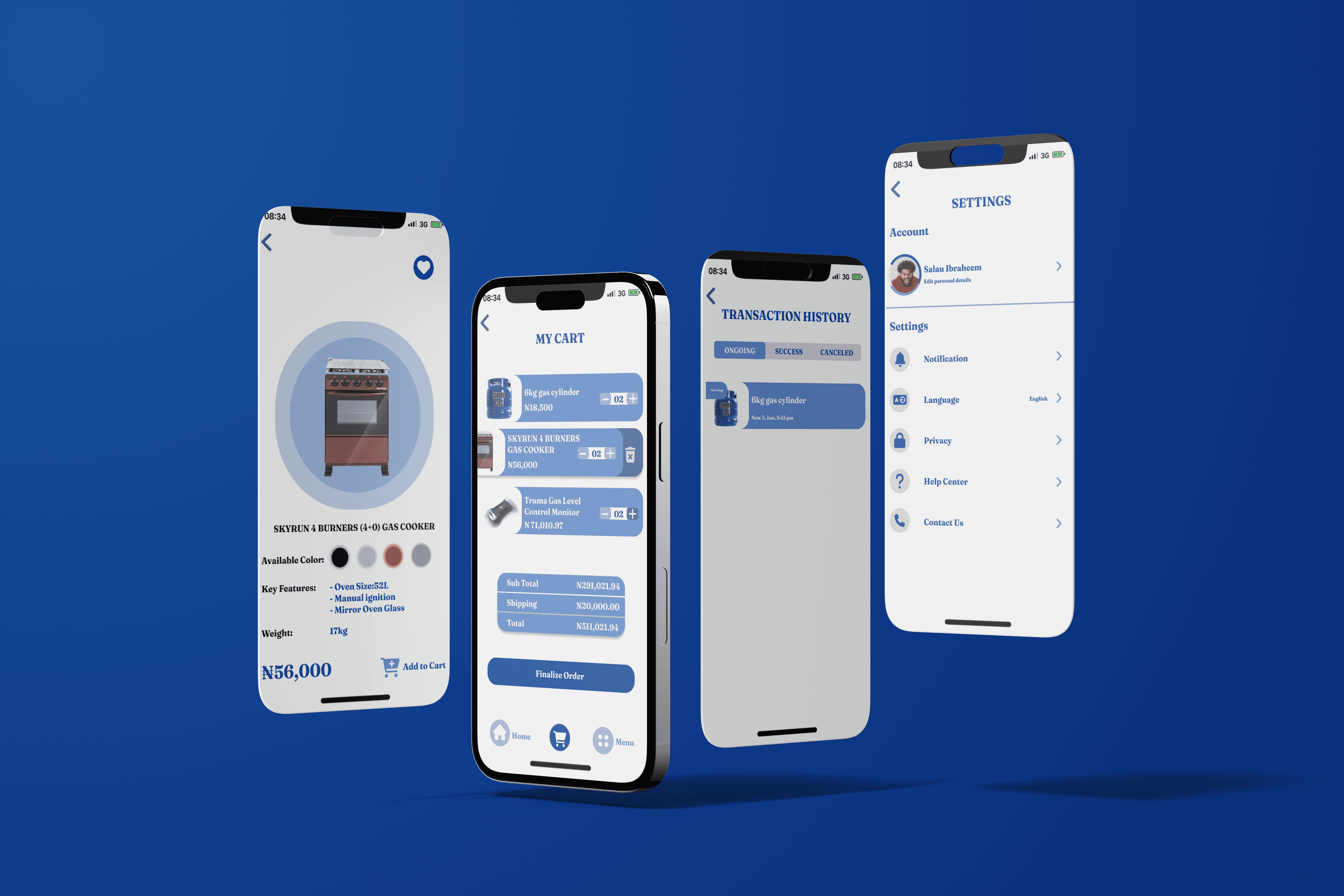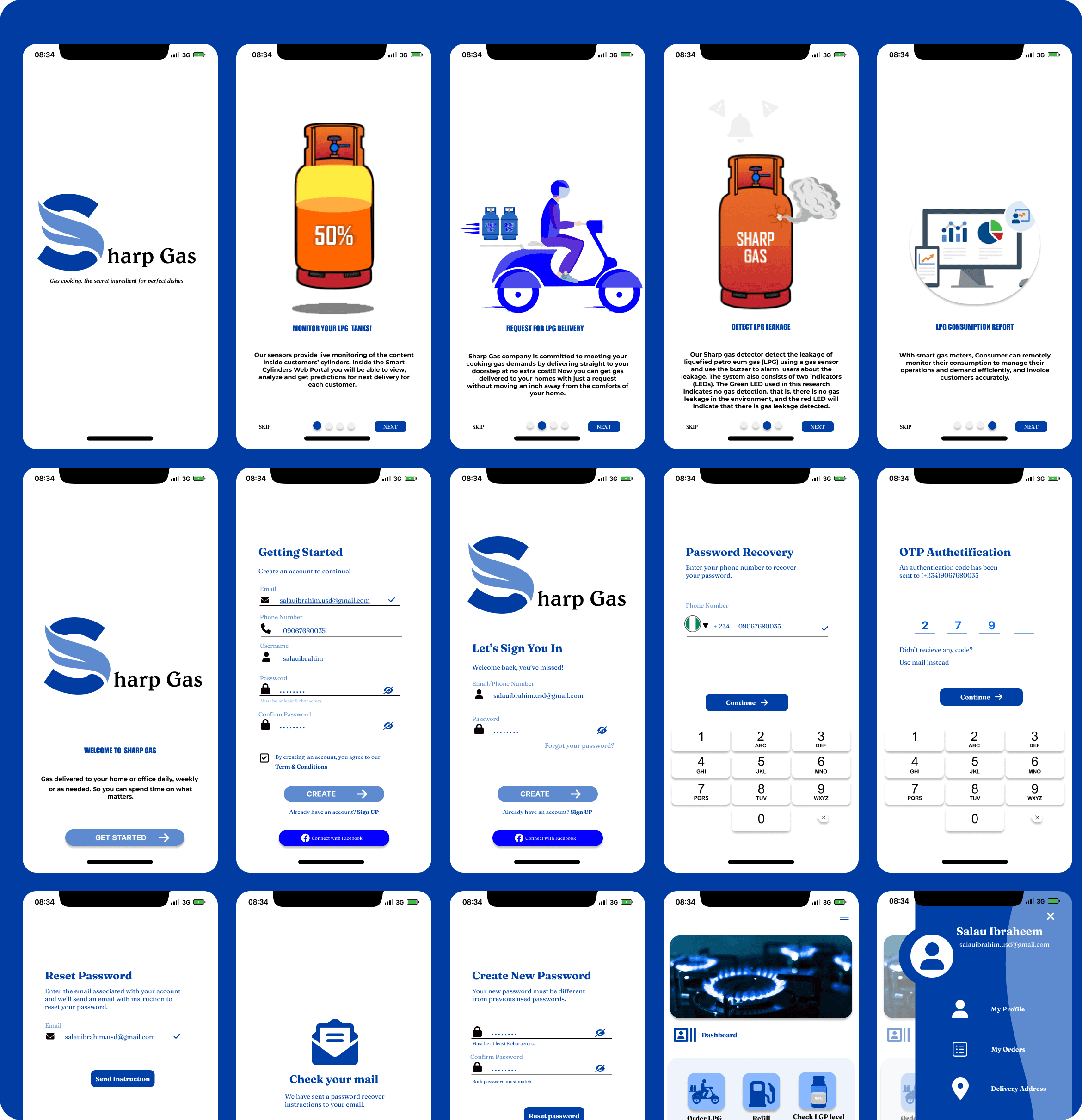 The Sharp Gas mobile app was designed and prototyped to enhance the user experience of managing gas cylinders for domestic and commercial use. The app provides a range of features, including purchasing gas cylinders, ordering gas refills, monitoring gas consumption, and integrating safety-focused alarms to detect leaks and remind users when their gas levels are low.